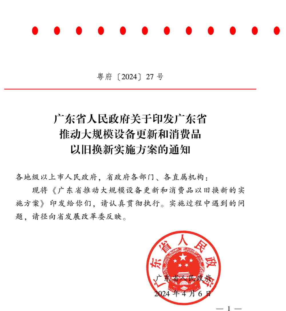 廣東省人民政府關于印發廣東省推動大規模設備更新和消費品以舊換新實施方案的通知(粵府[2024] 27號)